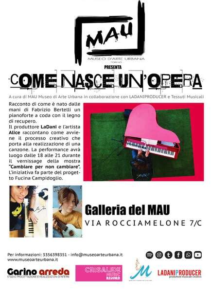Presso la Galleria del Museo d'Arte Urbana via Rocciamelone 7/C Torino In omaggio al tema di Archivissima "Cambiare per non Cambiare" sottende, nella circostanza, la volontà del Museo di perseguire il cambiamento ed il rinnovamento in sintonia con i tempi che mutano, pur mantenendosi fedele alla vocazione di essere, come dall'ormai lontano 1995, un progetto didattico sull'arte contemporanea unico nel suo genere, con l'obiettivo di rendere, tramite la partecipazione e la condivisione, i cittadini consci dell'importanza dell'arte nella dimensione pubblica, come fonte di arricchimento culturale ed elemento di attrattiva, promozione e riqualificazione dei territori, nel caso il Borgo Vecchio Campidoglio e, dal 2014, i molti quartieri di Torino ed i centri del Piemonte in cui il MAU è stato chiamato ad intervenire, con la realizzazione di oltre 300 opere murali. Qualificati artisti contemporanei hanno donato al MAU opere di formato medio-piccolo, che potranno essere acquistate a valori molto al di sotto delle reali quotazioni, per supportare il mantenimento della sede del Museo, nella forma della donazione liberale. Sarà ospite nella mostra LaDani, con il pianoforte nato dalle mani di Federico Bertelli, un pianoforte a coda con il legno di recupero che sarà un'installazione durante tutta la durata della collettiva d'arte. A cura di Edoardo Di Mauro ed Alberto Garino Opere di : Paolo Grassino, Angelo Barile, Gianluca Nibbi, Laura Avondoglio, Viola Barovero, Nice and The Fox, Masoudeh Miri, Sarah Bowyer, Ernesto Jannini, Silvia Fubini, Gec, Daniele D'Antonio, Carlo Galfione, Maura Banfo, Raffaella Brusaglino, Roberta Fanti, Gianfranco Sergio, Viola Gesmundo, Leonardo Santoli, Milla Bandiera, Gianni Gianasso, Gianni Tessari, Marco Martz, Roberta Toscano. Visitabile fino al 18 giugno 2022 su appuntamento. Info: +39 335 6398351 info@museoarteurbana.it www.museoarteurbana.it Col patrocinio e in collaborazione con Comune di Torino. Con il patrocinio della Circoscrizione 4 di Torino Enti sostenitori: Regione Piemonte, Fondazione Compagnia di San Paolo, Fondazione CRT, Camera di Commercio di Torino, Comune di Rivalta, Centro Commerciale Porte di Torino, Circoscrizioni 2, 6, 7 Comune di Torino. Sponsor tecnici : OIKOS la Pittura Ecologica, Fiammengo Federico srl Partner : Garino Arreda Studio di Interior Design, Officine Brand www.officinebrand.it, Galleria Campidoglio www.galleriacampidoglio.it.