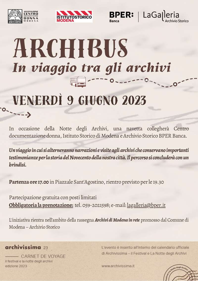 In occasione della Notte degli Archivi una navetta, in partenza alle 17.00 da Piazzale Sant'Agostino a Modena, collegherà tre archivi modenesi che conservano importanti testimonianze per la storia del Novecento: Centro documentazione donna, Istituto Storico di Modena, Archivio Storico BPER Banca. Il percorso si concluderà con un brindisi presso l'Archivio Storico BPER Banca. Rientro previsto per le 19,30 in Piazzale Sant'Agostino. L’evento è inserito nell’ambito della rassegna "Archivi di Modena in rete" promosso dal Comune di Modena – Archivio Storico. Per prenotazioni: tel. 059 2021598, mail: lagalleria@bper.it Instagram: @lagalleriabper. L'orario di apertura dell'Istituto storico di Modena è dalle 15.00 alle 20.00.