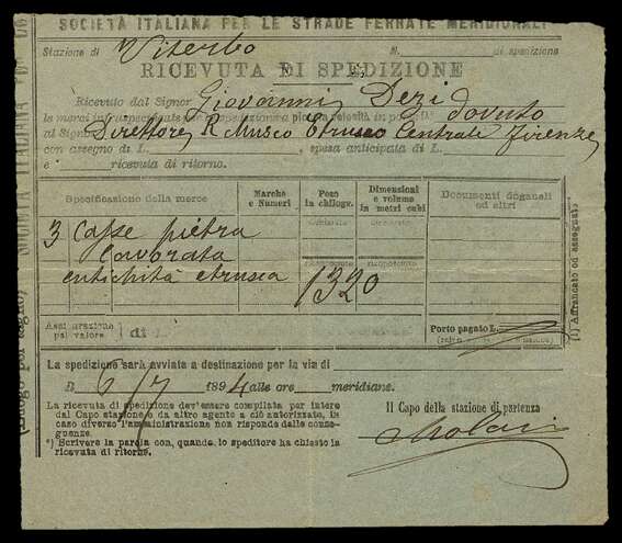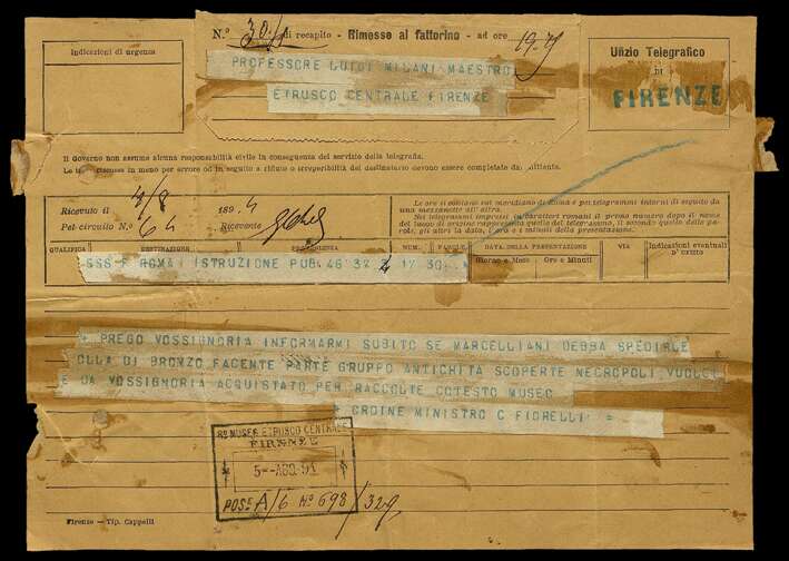 L'archivio storico del Museo Archeologico Nazionale di Firenze conserva la documentazione prodotta a partire dal 1892 dal Museo stesso e dalla Soprintendenza per le Antichità dell'Etruria. Fra le pagine degli atti istituzionali e delle lettere ministeriali emergono storie avvincenti di persone, viaggi e scoperte: in quegli anni infatti, il direttore del museo, Luigi Adriano Milani, era impegnato a costruire e arricchire il percorso espositivo e, per fare questo, oltre a promuovere gli scavi governativi, metteva in atto una complessa politica di acquisti di reperti archeologici provenienti da scavi di privati e dal mercato antiquario, per i quali intesseva rapporti con i nobili possessori dei terreni così come con gli scavatori di professione.