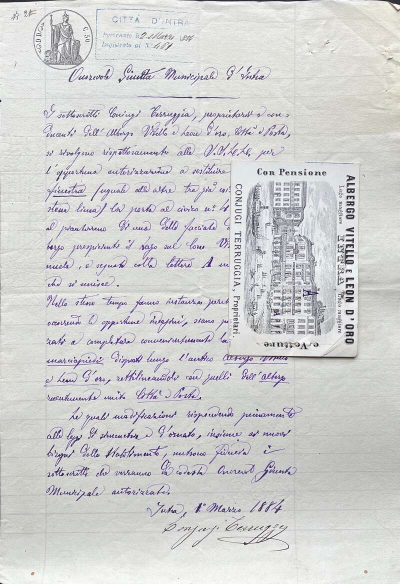 Biglietto da visita dell’Albergo Vitello e Leon d’oro allegato alla richiesta di modifica delle aperture.