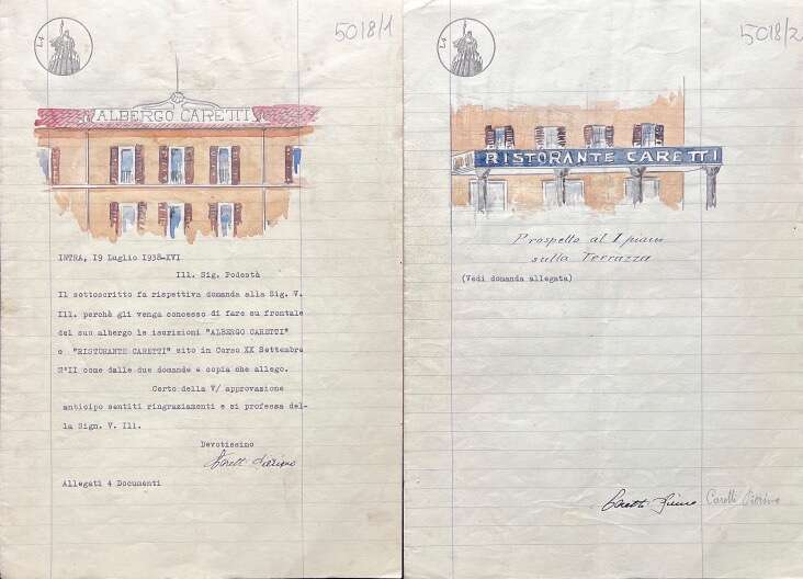 DIsegni ad acquerello a corredo della richiesta di esposizione di insegne sul fronte dell’Albergo ristorante Caretti.