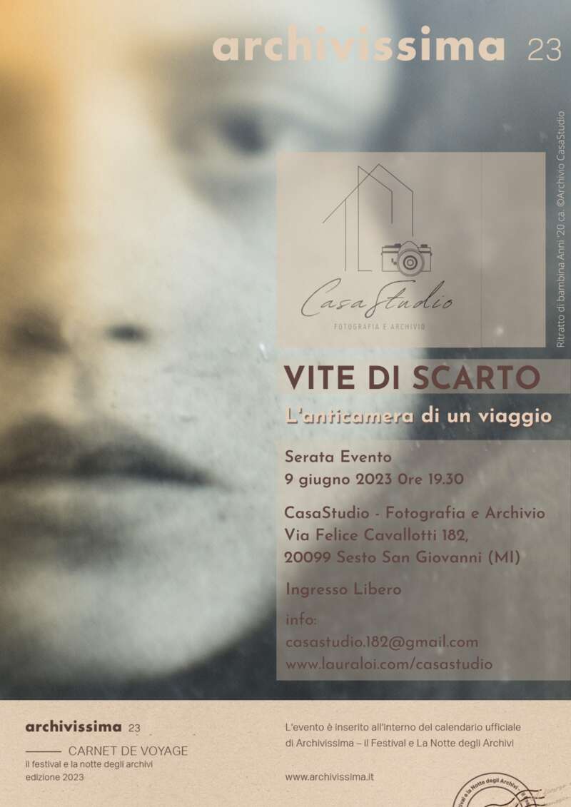 Per La Notte degli Archivi CasaStudio presenta VITE DI SCARTO. UNA RIFLESSIONE LIQUIDA, un progetto di ricerca che nasce dal materiale fotografico di Archivio CasaStudio. Partendo dal saggio "Vite di Scarto" di Zygmunt Bauman si snoda una riflessione sull'accumulo smodato e bulimico di immagini, sul loro vorace utilizzo, consumo frenetico e cinico abbandono. Ma raccogliere e conservare le vite degli altri e dare loro nuova vita con nuove storie è tuttavia aggiungere altre immagini alle immagini? È ancora e sempre accumulo? Non c'è dunque una via d'uscita? Questo viaggio nel viaggio proposto da Laura Loi, fondatrice e curatrice di Archivio CasaStudio, non è soltanto l'anticamera di un percorso molto piu ampio, un cammino verso le stanze di una grande casa fatta di volti, attimi di vita, luoghi dimenticati. È anche un invito a guardare oltre, allungare la vista, entrare dentro le immagini, osservare senza fretta, scegliere dei particolari, riscoprirne la poesia. Aprirsi a nuovi orizzonti.
