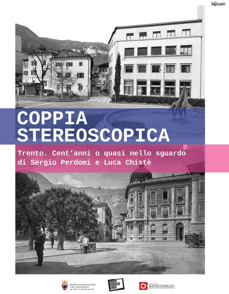 Spin-off della prima mostra interamente dedicata a "Sergio Perdomi (1887-1935). Il fotografo della Venezia Tridentina", allestita fino al 1° ottobre nelle sale del Castello del Buonconsiglio a Trento, "Trento. Cent'anni o quasi nello sguardo di Sergio Perdomi e Luca Chistè" mette a confronto le vedute urbane di Sergio Perdomi con le fotografie riprese oggi, in identiche condizioni, dal fotografo Luca Chistè. Due sguardi fotografici per una stessa città dilatata nel tempo: una stereoscopia sui generis che non coglie la tridimensionalità ma la mutabilità degli spazi sotto le spinte della storia e delle umane necessità.
