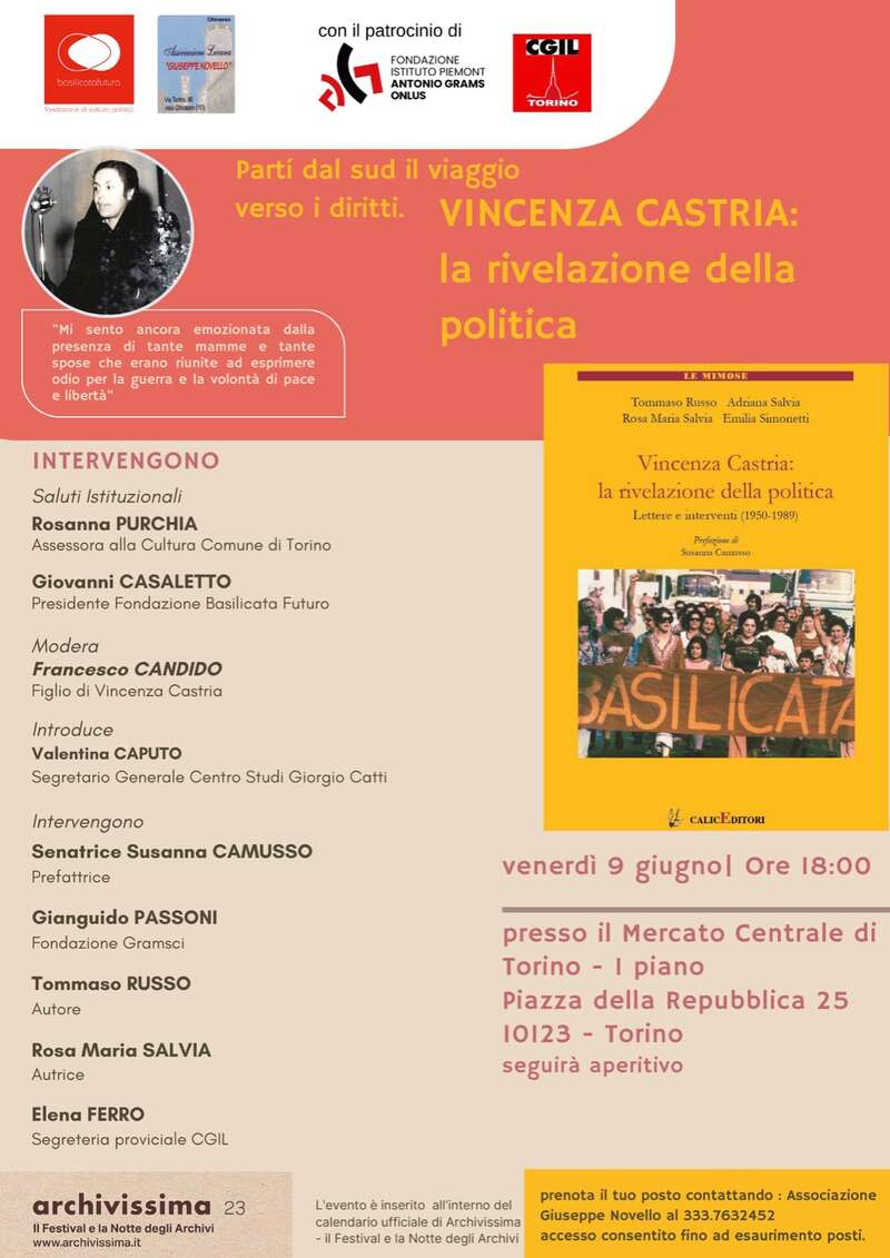 Presentazione del volume che ripercorre il "viaggio" politico di Vincenza Castria, protagonista delle lotte contadine a Montescaglioso e in seguito attivista del PCI e dell'UDI di cui il volume ricostruisce gli scambi e le lettere coi maggiori esponenti fino agli anni Novanta. In seguito all'uccisione del marito avvenuta nell'ambito di una manifestazione per la liberazione delle terre, Vincenza divenne un punto di riferimento per il movimento di lotta e dell'emancipazione femminile. L'iniziativa si svolge al mercato centrale di Torino, con la partecipazione, oltre agli autori, dell'assessore alla cultura Rosanna Purchia, di Valentina Caputo del centro studi Giorgio Catti, del sottoscritto, di Gianguido Passoni del Gramsci Torino, Susanna Camusso ed Elena Ferro segretaria provinciale CGIL.