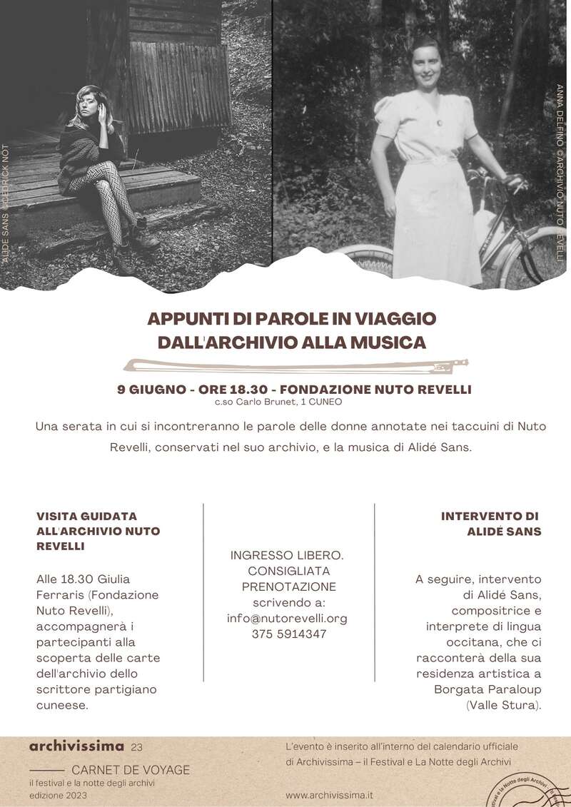Alle ore 18.30, Giulia Ferraris (Fondazione Nuto Revelli), accompagnerà i partecipanti alla scoperta delle carte dell'archivio dello scrittore partigiano cuneese e degli oggetti che animano la sua casa; a seguire, intervento di Alidé Sans, compositrice e interprete di lingua occitana, che ci racconterà della sua residenza artistica alla Borgata Paraloup (Valle Stura).