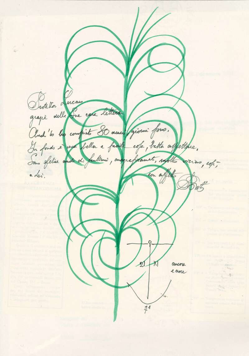Alla richiesta di Lercaro di donare un’opera per allestire una “galleria domestica” presso la residenza per gli studenti di Villa San Giacomo, Gio Ponti risponde con immediatezza ed affettuosa reverenza, scrivendo «Illustre e caro Protettore di noi Architetti, è per me un onore e mi riempie di gioia» e, assicurando il proprio contributo, invoca perdono per la «lettera colorata», che è espressione della “allegresse de ma vieillesse”, quella gioia della vecchiaia che probabilmente è stato d’animo di entrambi i protagonisti di questo scambio epistolare.