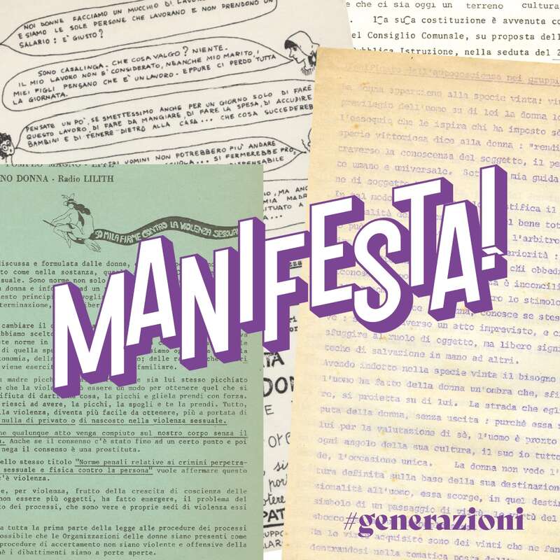 In occasione della “Notte degli archivi 2021”, l’Archivio di storia delle donne di Bologna propone una riflessione sul tema del linguaggio intergenerazionale dal titolo “Manifesta! Femminismi a confronto riannodando il filo delle parole”. Un podcast realizzato a due voci, due generazioni, due tipologie di materiale documentario per mettere a confronto le parole d’ordine, i linguaggi e gli immaginari della diversa documentazione conservata nell’archivio, capaci di evidenziare le diverse modalità di dialogo tra le generazioni.