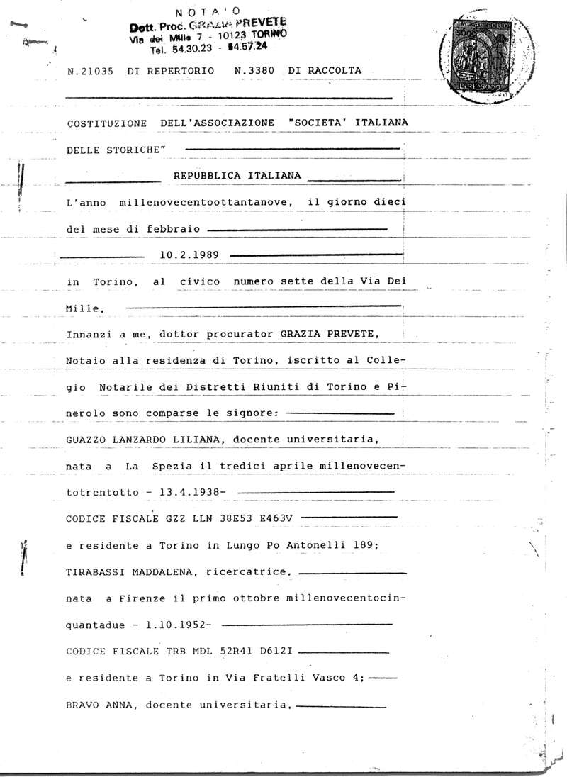 presso la Casa internazionale delle donne. Il complesso documentario rappresenta il fondo istituzionale della Società Italiana delle Storiche (SIS) e ne documenta le attività svolte a partire dalla fondazione, avvenuta nel 1989, fino al 2019. L’archivio conserva anche cinque fondi personali depositati da alcune socie che hanno ricoperto cariche sociali: si tratta dei fondi personali: “Annarita Buttafuoco”, “Maria Teresa Sega”, “Raffaella Baritono”, “Dinora Corsi”, “Marina Caffiero”. Il fondo conserva oltre all’atto costitutivo e gli statuti, per lo più documenti di carattere amministrativo e contabile, come bilanci e rendiconti, registri contabili, fatture e ricevute, documenti relativi agli abbonamenti alla rivista «Genesis» e alle collaborazioni attivate in occasione delle iniziative promosse dalla SIS; conserva inoltre la corrispondenza con soggetti esterni, comunicati interni, documenti relativi alle attività degli organi sociali (Assemblea delle socie e Consiglio Direttivo) e delle Commissioni interne, richieste di iscrizione, elenchi, schede personali e dati delle socie; tra le partizioni più consistenti si segnala la serie “Attività scientifica e di formazione” che documenta le attività e le iniziative svolte dalla SIS nella promozione e divulgazione della ricerca storica, didattica e documentaria nell’ambito della storia delle donne e della storia di genere (la serie si articola a sua volta in 11 sottoserie: “Congressi”, “Convegni e seminari”, “Corsi di formazione”, “Scuola estiva di storia delle donne”, “Agenda”, “Newsletter della SIS”, “Genesis”, “Premi”, “iniziative e progetti vari”, “Attività editoriale”, “Partecipazione a organismi e associazioni”). Si conservano inoltre manifesti e locandine, volantini e opuscoli delle manifestazioni e delle iniziative organizzate o promosse dall’Associazione, nonché del materiale sonoro (interviste e registrazioni di convegni e seminari).