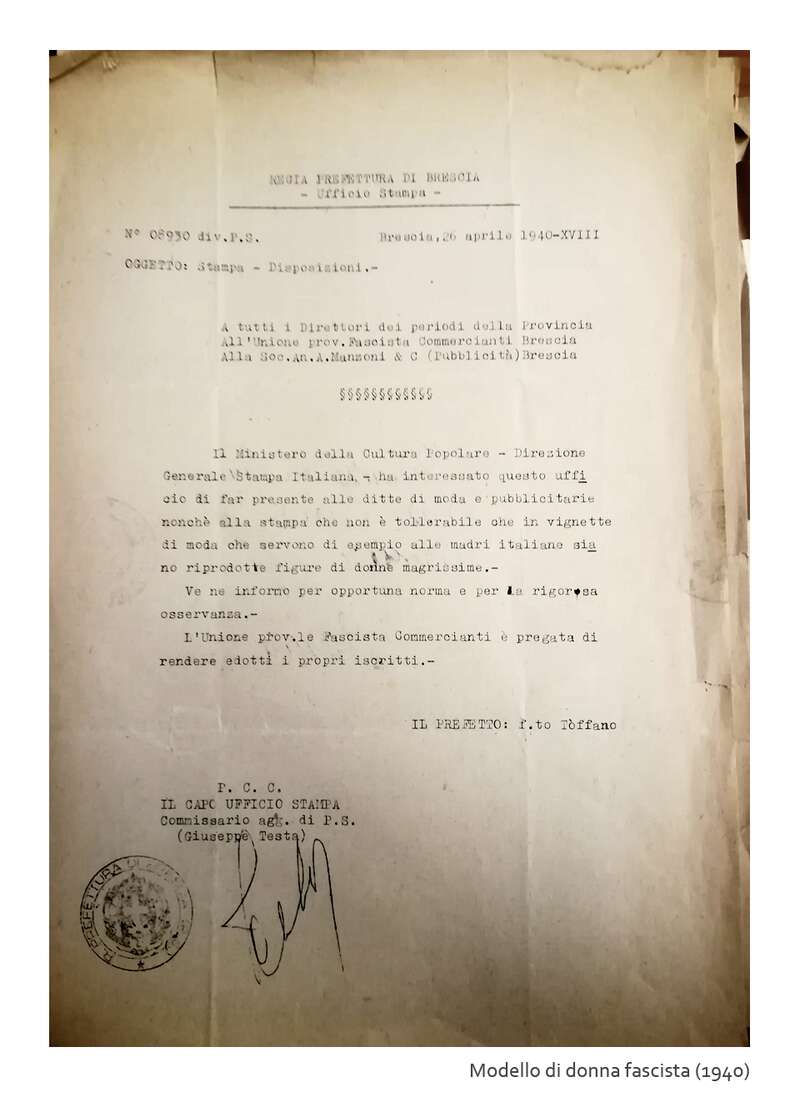 Donne e Guerra è l’ultima sezione di questa mostra audiovisiva dedicata alle donne. Due documenti e due letture tratti Carte del vescovo Tredici. Il primo è una Circolare della Regia Prefettura di Brescia –riguardo all’immagine della donna veicolata da giornali e pubblicità, che abbiamo intitolato “MODELLO DI DONNA FASCISTA”.