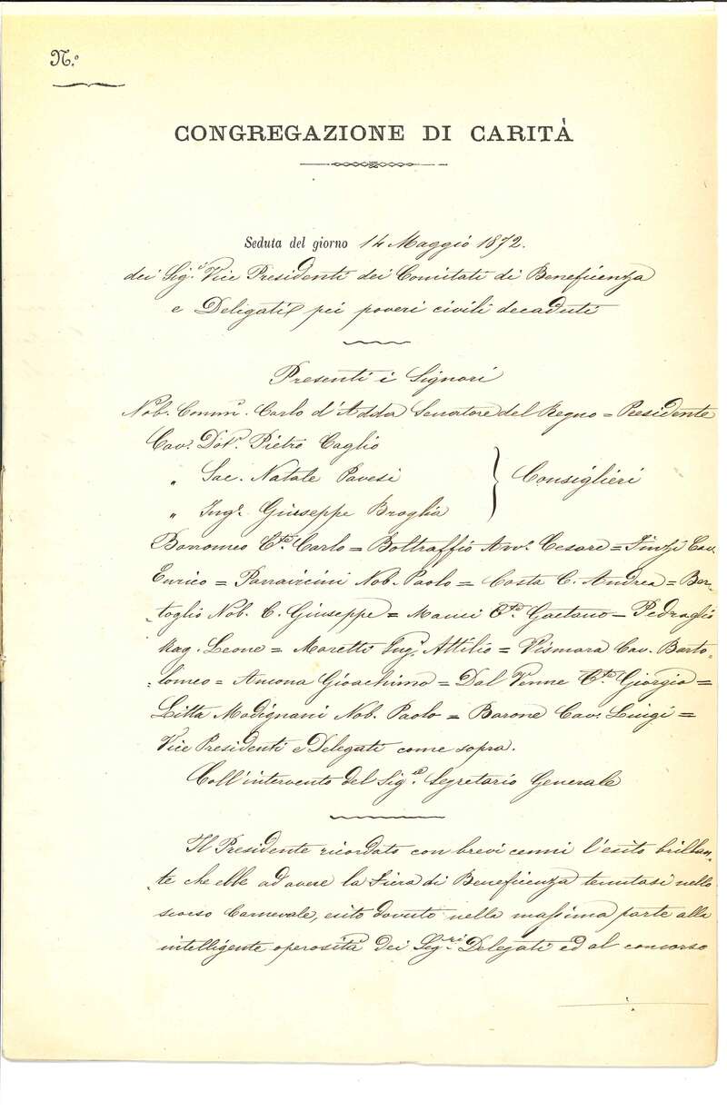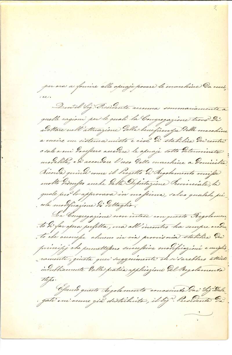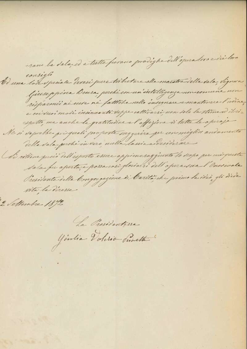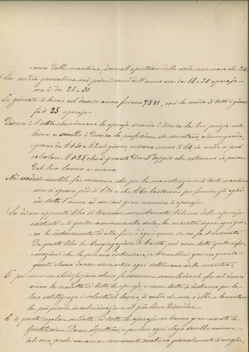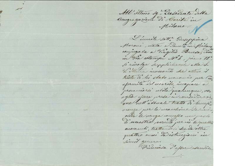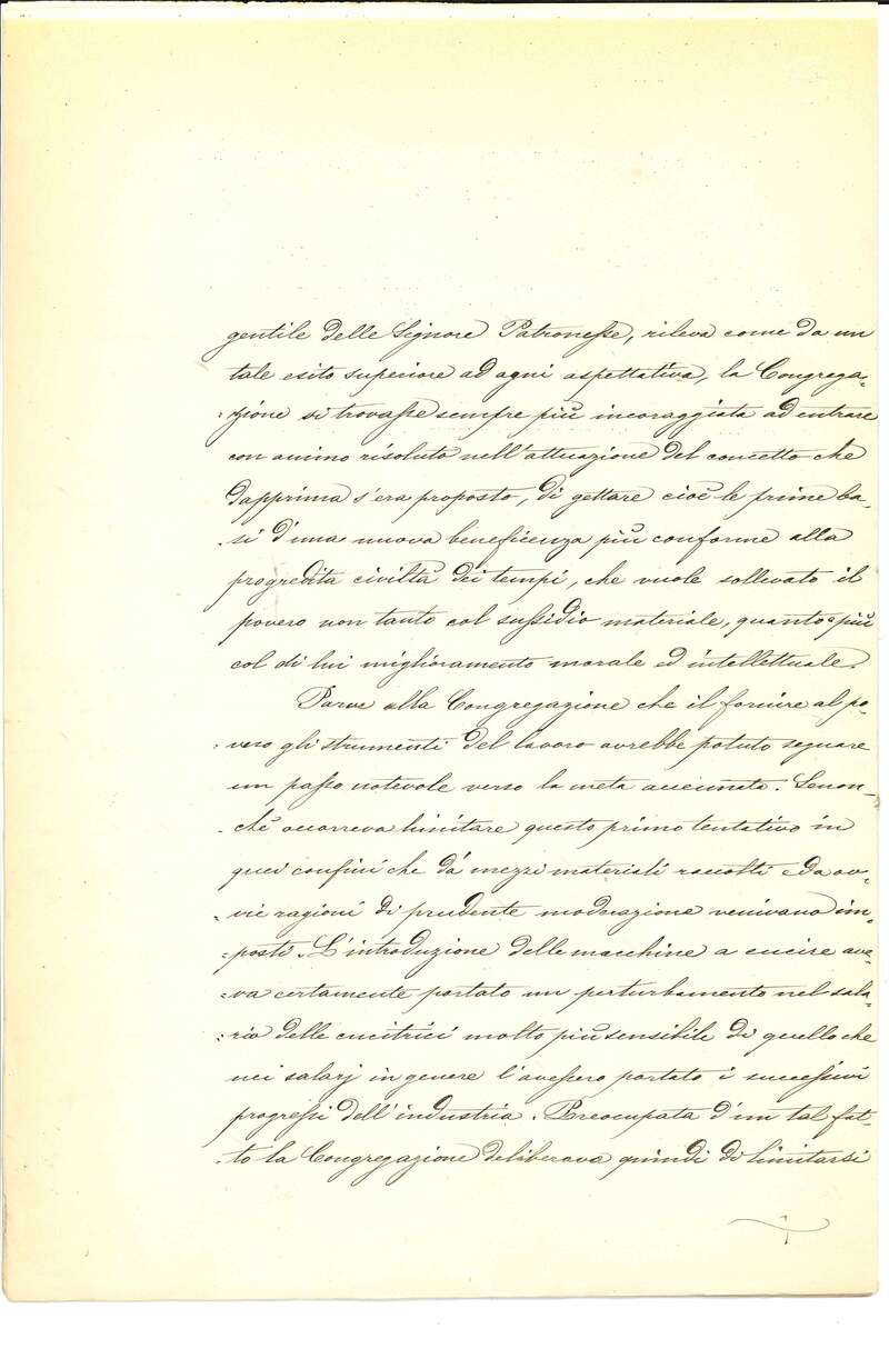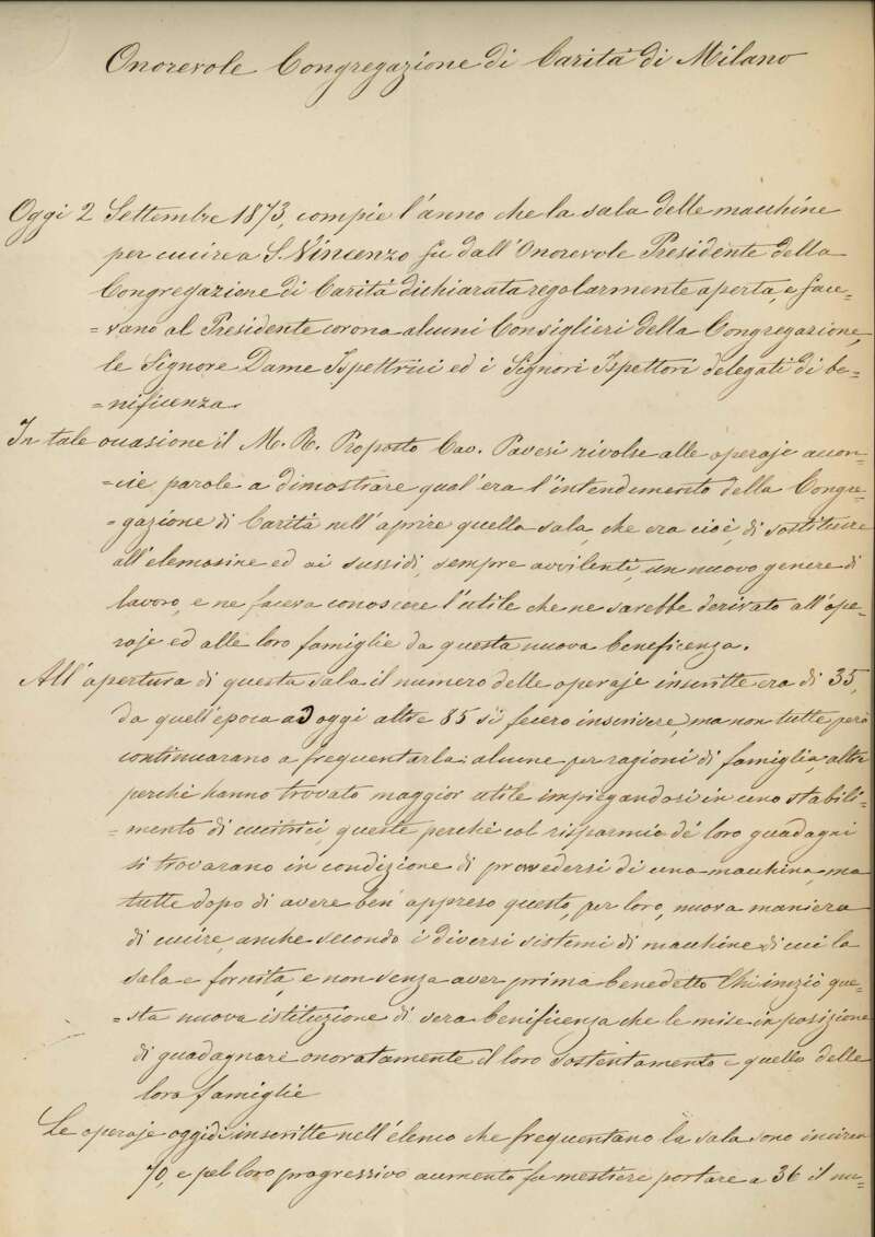 Nel 1872 la Congregazione di Carità istituì una forma di sostegno innovativa, adatta a una società in evoluzione: coi proventi della Fiera di Beneficenza di quell'anno acquistò oltre 100 macchine da cucire, in parte distribuite a domicilio, e allestì due sale di lavoro - nella Pia Casa di S. Vincenzo e presso il Carmine - per formare le operaie. Sotto la guida di maestre e ispettrici della Congregazione di Carità le due sale rimasero attive per quattro anni. Questa prima esperienza milanese venne replicata negli anni successivi in numerose altre città