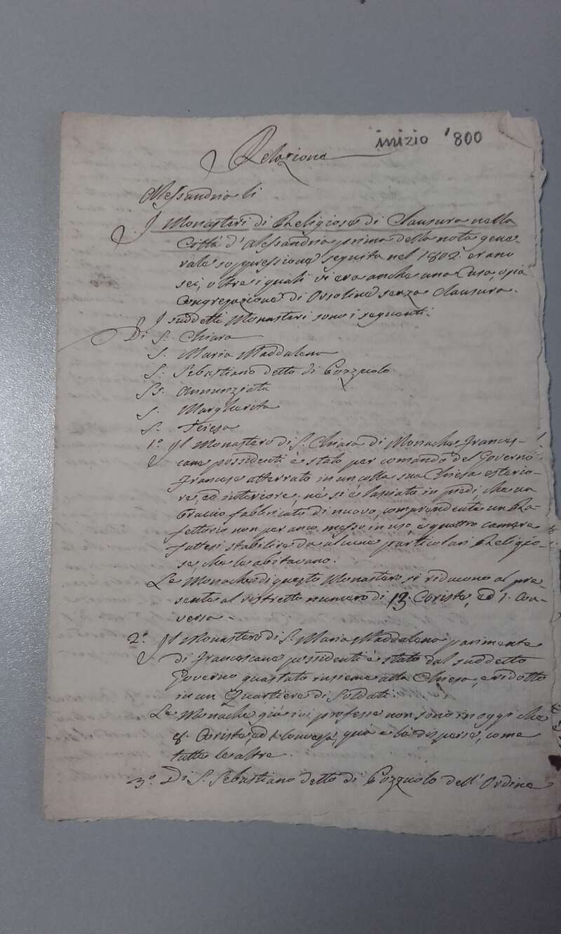 l’anzianità” e una “Relazione dei monasteri di religiose di clausura nella città di Alessandria prima della nota