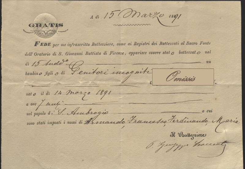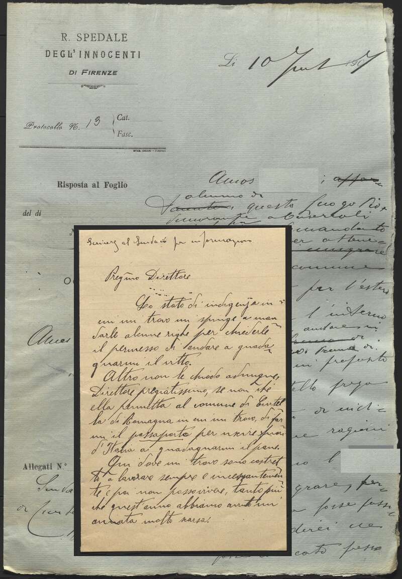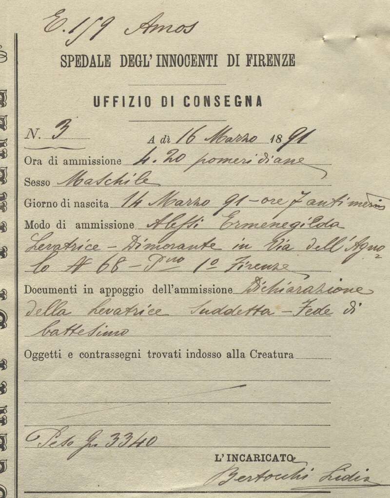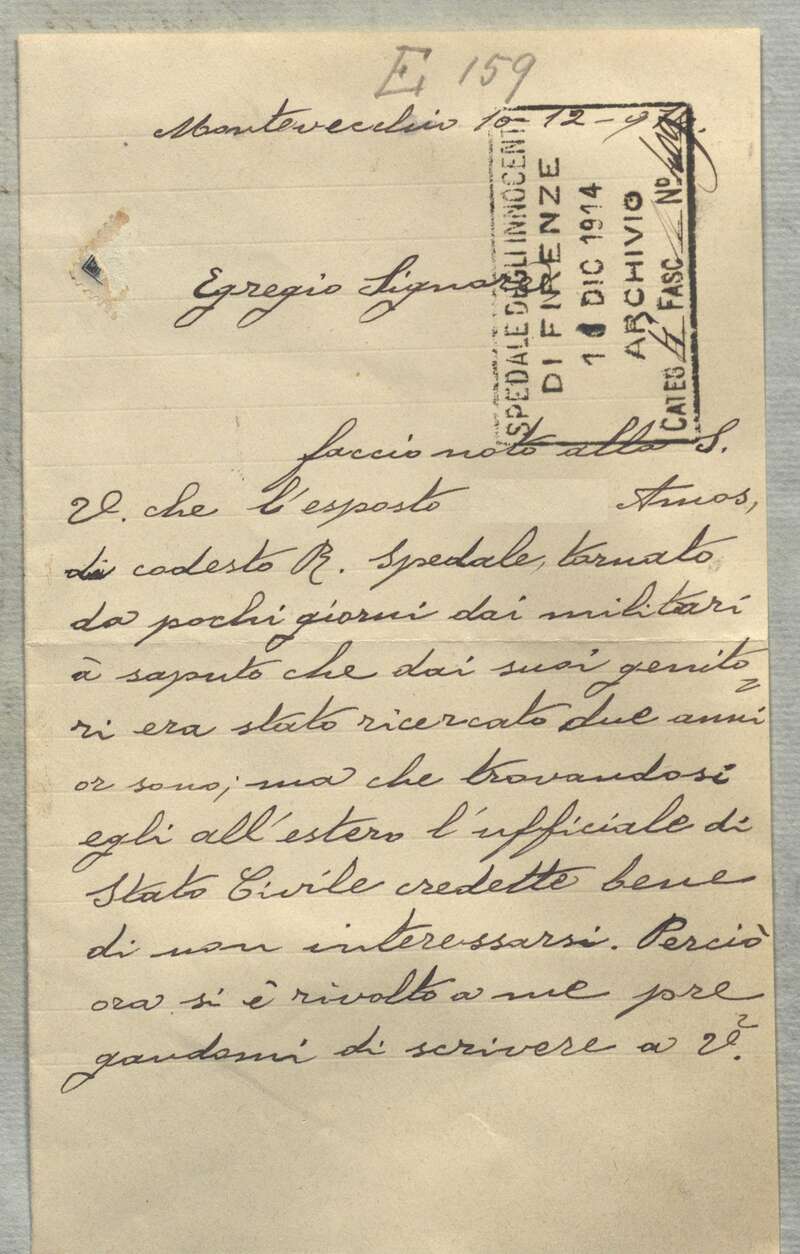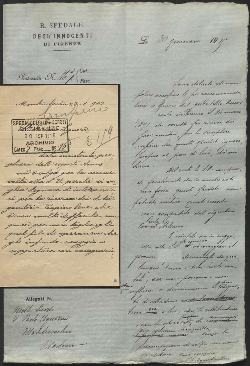 Attraverso le carte dell'Archivio storico dell’Istituto degli Innocenti è stato possibile ricostruire la storia di Amos, un ex Nocentino, abbandonato a pochi giorni dalla nascita, che più volte nella sua vita ha manifestato il desiderio di conoscere le proprie origini. Desiderio che si è rafforzato durante la sua esperienza come soldato nella Grande Guerra. Non si è arreso davanti ai “no”, ma ha cercato con ogni mezzo a sua disposizione di arrivare alla verità.