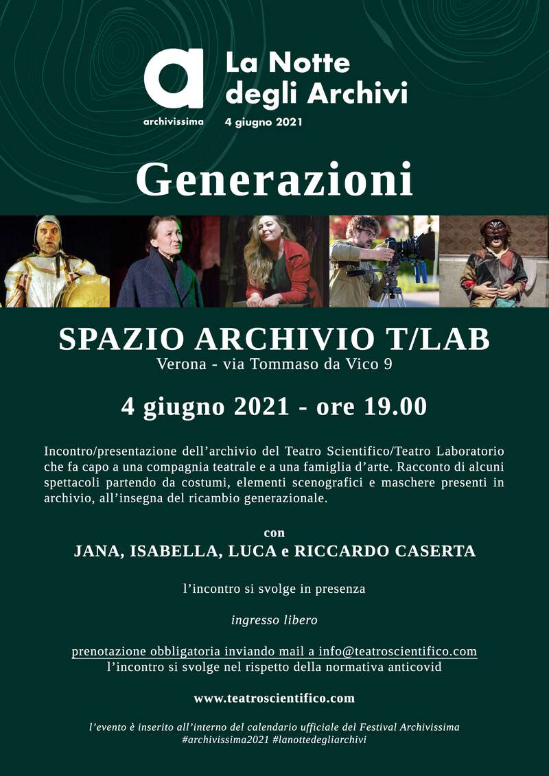 Presentazione dell’Archivio del Teatro Scientifico / Teatro laboratorio che fa capo a una compagnia teatrale e a una famiglia d’arte. Racconto di alcuni spettacoli partendo da costumi, elementi scenografici e maschere presenti in archivio, all’insegna del ricambio generazionale.