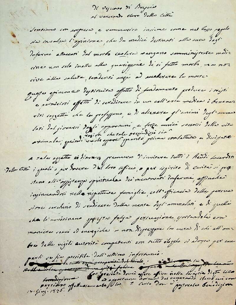 Brescia, 1836. Carteggio tra il vescovo Gabrio Maria Nava e il Delegato provinciale