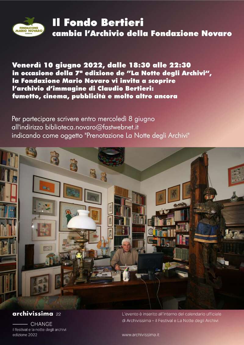 A partire da questa riflessione, in occasione de La Notte degli Archivi 2022, la Fondazione Novaro intende interrogare il fondo Bertieri e mostrare a un pubblico più vasto possibile cosa custodisce. La sera del 10 giugno, a partire dalle 18,30 è prevista l’apertura straordinaria della Fondazione con visite guidate al patrimonio del fondo Bertieri.