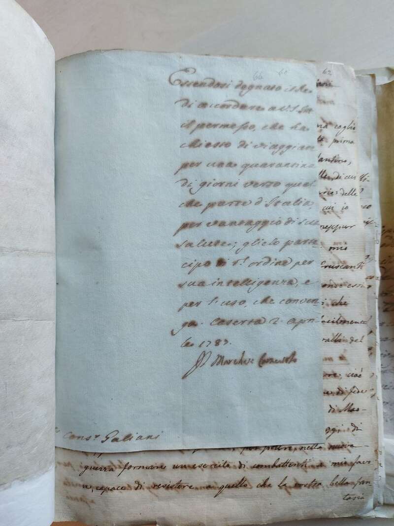 10) XXXI.B.17.08 Lettere del marchese Domenico Caracciolo a Ferdinando Galiani, Licenza di viaggio, s.l., s.d.