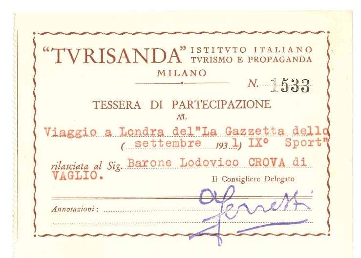 Un plico di carte, programmi, biglietti, dépliants, lettere e cartoline. Una memoria custodita nell’archivio di una famiglia di antica nobilità che vive in pieno la modernità del secolo breve: sono i documenti, conservati nel fondo famiglia Crova di Vaglio, relativi al viaggio che intraprese il barone Lodovico Crova di Vaglio nel settembre 1931 per raggiungere Londra, Parigi e Bruxelles.
