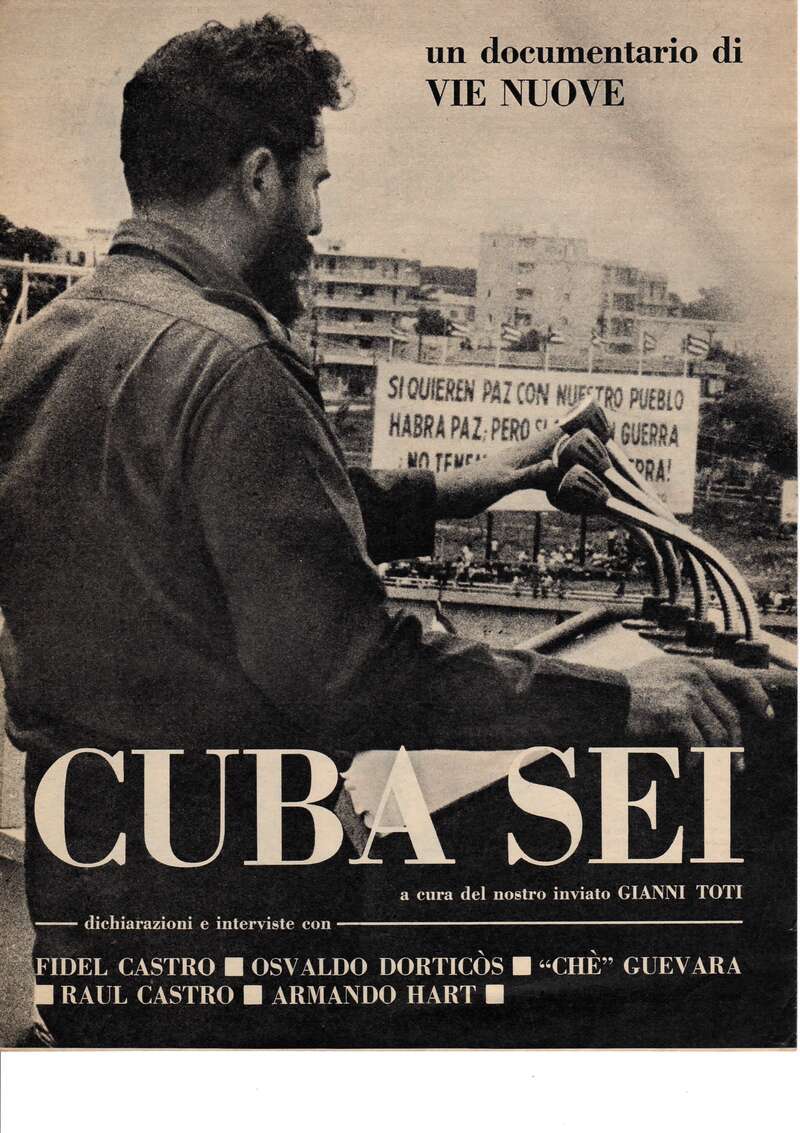 Quando parte per Cuba, Gianni Toti è inviato speciale del settimanale “Vie Nuove”. È il 1964. È la prima volta che “Vie Nuove” dedica un’inchiesta a Cuba. Toti ha con sé la macchina fotografica e la cinepresa. Ha appreso a scattare fotografie da Ando Gilardi, suo collega durante gli anni in cui ha diretto il rotocalco della CGIL “Lavoro”, tra il 1952 e il 1958. Con la cinepresa Toti ha già documentato amatorialmente alcuni viaggi con la moglie, la pittrice ungherese Marinka Dallos: i ritorni in Ungheria, qualche gita domenicale, ma anche la Tunisia e poi la Spagna, dove ha realizzato tra il 1962 e il 1963 un reportage per “Vie Nuove”.