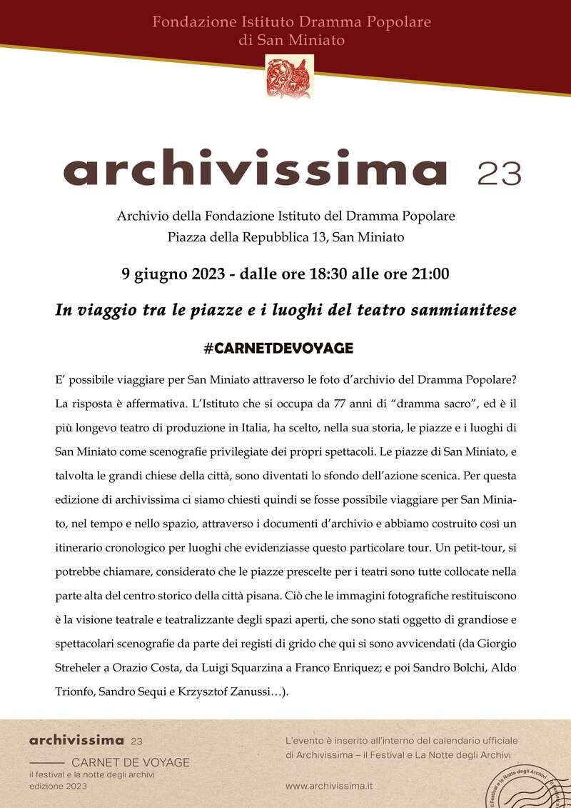 È possibile viaggiare per San Miniato attraverso le foto d’archivio del Dramma Popolare? La Fondazione Dramma Popolare di San Miniato, ha scelto, nella sua storia, le piazze e i luoghi di San Miniato come scenografie privilegiate dei propri spettacoli. Le piazze di San Miniato, e talvolta le grandi chiese della città, sono diventati lo sfondo dell’azione scenica. Un viaggio attraverso i documenti d’archivio della Fondazione.