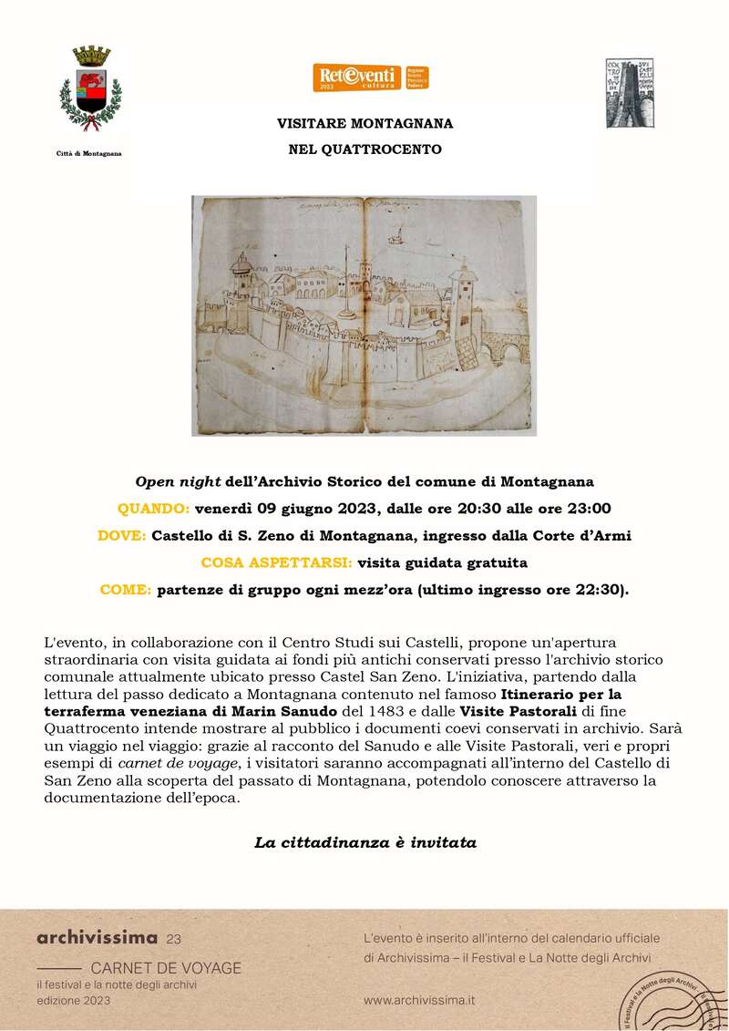 L'evento, in collaborazione con il Centro Studi sui Castelli, propone un'apertura straordinaria con visita guidata ai fondi più antichi conservati presso l'archivio storico comunale attualmente ubicato presso Castel San Zeno. L'iniziativa, partendo dalla lettura del passo dedicato a Montagnana contenuto nel famoso Itinerario per la terraferma veneziana di Marin Sanudo del 1483 e dalle Visite Pastorali di fine Quattrocento intende mostrare al pubblico i documenti coevi conservati in archivio. Sarà un viaggio nel viaggio: grazie al racconto del Sanudo e alle Visite Pastorali, veri e propri esempi di carnet de voyage, i visitatori saranno accompagnati all’interno del Castello di San Zeno alla scoperta del passato di Montagnana, potendolo conoscere attraverso la documentazione dell’epoca.