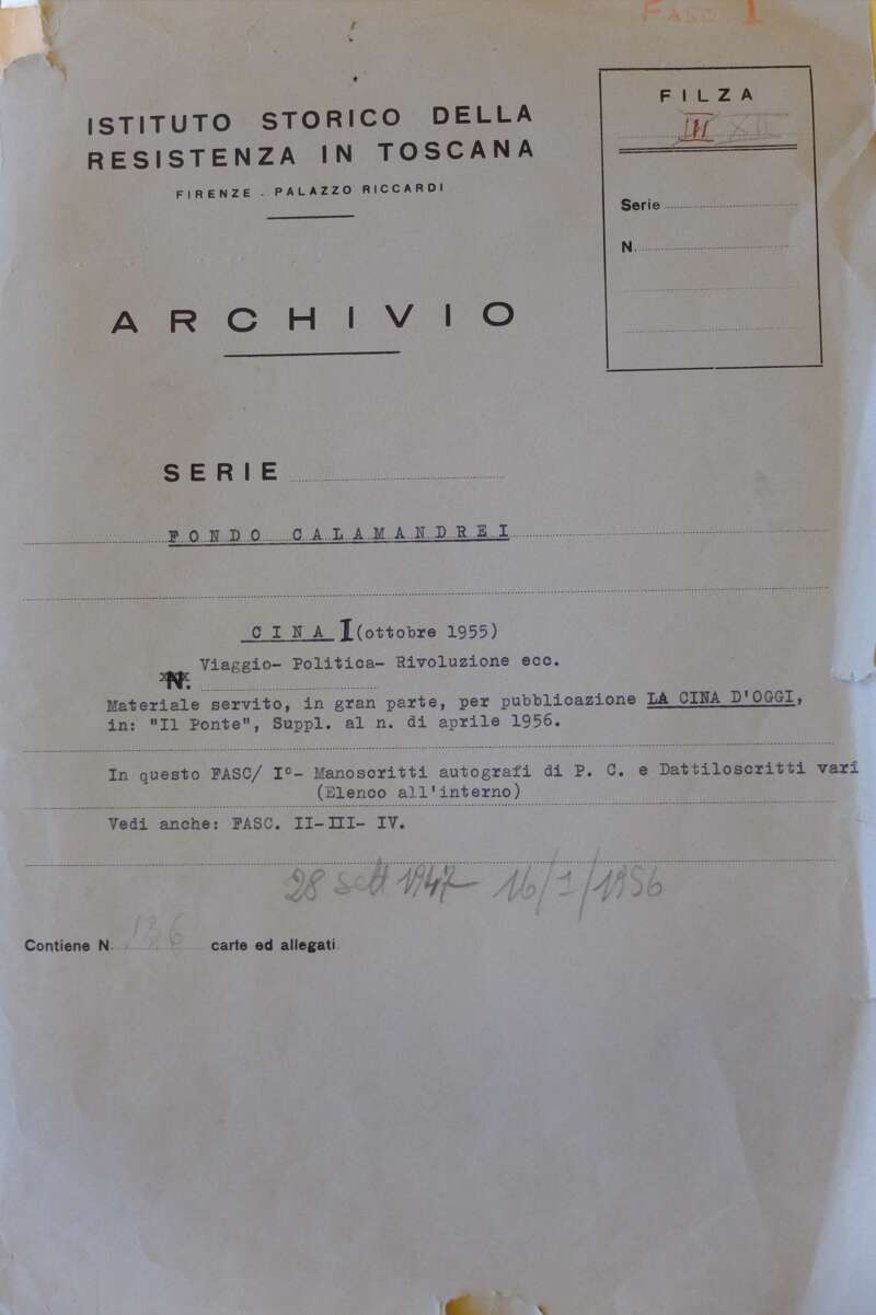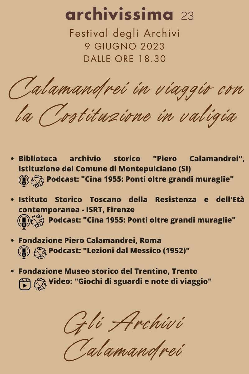 La Biblioteca Archivio Piero Calamandrei di Montepulciano e l’Istituto Storico Toscano della Resistenza e dell'Età contemporanea presentano un podcast sul viaggio in Cina 1955 ("Cina 1955: Ponti oltre grandi muraglie") corredato di foto dei materiali archivistici custoditi.