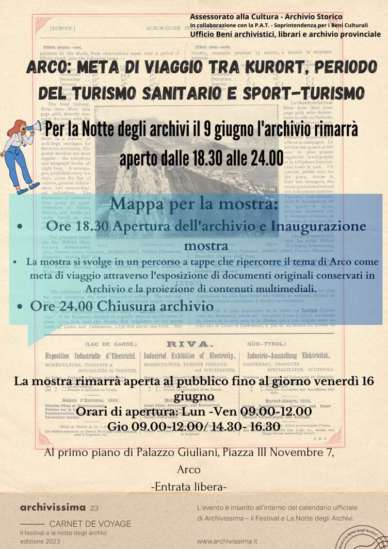 In questa mostra si propone un percorso a tappe esplorando la documentazione in possesso dell’archivio storico di Arco e che è presentata all’interno dei video, per scoprire com’è cambiato il concetto di meta turistica per arrivare a quello di luogo di cura per la tubercolosi e infine ai giorni nostri come luogo prediletto dagli sportivi. Attraverso l’esposizione dei documenti originali si vuole portare il visitatore nel mondo di Arco e dintorni per conoscere e apprezzare questa cittadina che nel corso degli anni è cambiata, si è evoluta ma ha in ogni suo vicolo un pezzo di storia.