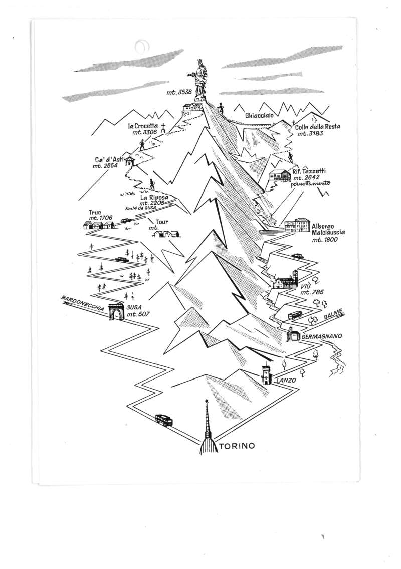 Il 12 agosto 1923 veniva consacrato l’altare ed il rifugio e la cappella aperti al pubblico; una costruzione in muratura a 3537 metri, con la povertà di mezzi disponibili in quegli anni, era gesta non comune e non facile. Non autotrasporti oltre Susa, non teleferiche, ma dorso di mulo o spalle d’uomo. Con queste parole – datate 1938 - nell’Archivio Centrale della Giovane Montagna viene rievocata la grande iniziativa che quest’anno compie un secolo. Nel 1923 la Sezione di Genova non esisteva ancora e il suo “battesimo del Rocciamelone” avviene a pochi mesi dalla fondazione – proprio nel 1938 - in occasione dei festeggiamenti per i 15 anni del Rifugio Santa Maria. Un gruppo di entusiasti giovani Soci, con in tasca un biglietto ferroviario Genova-Bussoleno, arriva a mezzanotte di sabato 2 luglio in Val Susa; la domenica, terminata la gita, riesce a prendere il treno del ritorno alle 19,30. La Presidenza Centrale giudica “faticosa” la scelta degli orari dei genovesi, giustificandola con la giovinezza e apprezzandone la partecipazione, come si legge in due frasi di una lettera diretta alla Sezione qualche tempo prima: Voi siete giovani! e Ci teniamo molto alla vostra presenza! Dieci anni dopo – nel clima euforico del dopoguerra – viene organizzato un evento intersezionale domenica 12 settembre 1948 per celebrare il venticinquesimo della cappella che, citando un documento d’archivio, ha un significato tutto proprio, ricco di tradizione e di poesia. Si prenotano venti genovesi, non di più perché, essendoci appena stato un accantonamento, le finanze dei Soci sono basse, come era accaduto l’anno prima relativamente alla partecipazione al Convegno di Oropa1. Con un mezzo tipico dell’epoca, un autocarro (lascito degli alleati nel 1945) attrezzato per il trasporto di persone preso a noleggio, il gruppo arriva sabato 11 a Margone in Valle di Usseglio; da qui in quattro ore sale al Rifugio Tazzetti per passare la notte e – ahimè – al mattino deve rinunciare a proseguire per maltempo. A causa di questo nefasto risultato dell’uscita, il Rocciamelone in alcuni documenti successivi viene soprannominato Docciamelone! Certamente più fortunata (dal punto di vista meteo) è la gita dei giorni 18-19 settembre 1954, organizzata dalla Sezione di Torino a cui Genova si aggrega, per – come si legge in archivio - dare un piccolo, ma amoroso omaggio alla Madonna in quest’anno destinato a celebrare le Sue glorie.