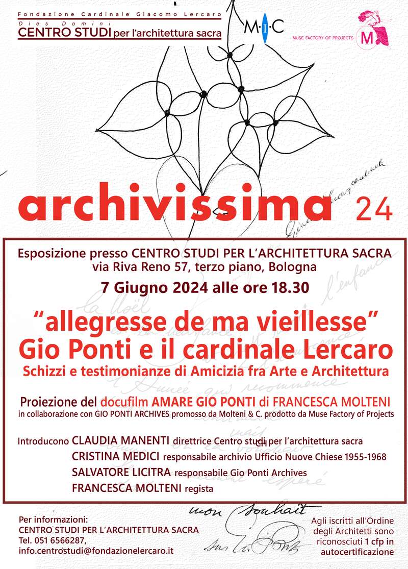 Venerdì 7 giugno alle ore 18.30 presso il Centro studi per l’architettura sacra della Fondazione Lercaro in via Riva Reno 57 a Bologna, esposizione della corrispondenza epistolare tra l’architetto Gio Ponti e il Cardinale Giacomo Lercaro, vescovo di Bologna tra il 1952 e il 1968, e proiezione del film “Amare Gio Ponti” di Francesca Molteni in collaborazione con Gio Ponti Archives, un omaggio al grande maestro del ‘900 promosso da Molteni&C, prodotto da Muse Factory of Project.