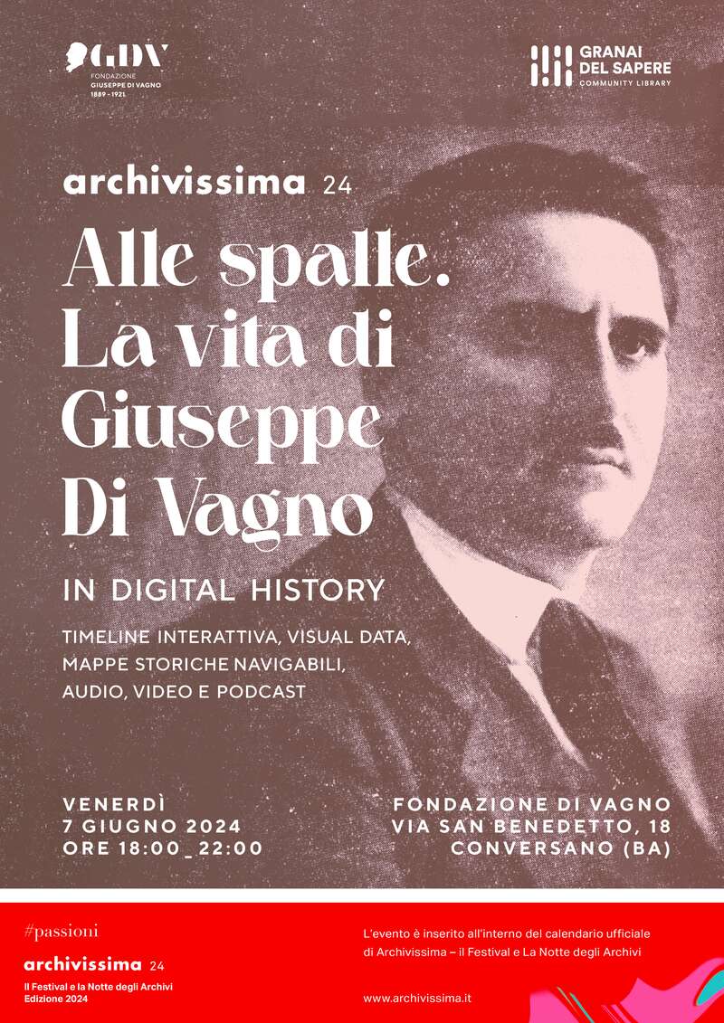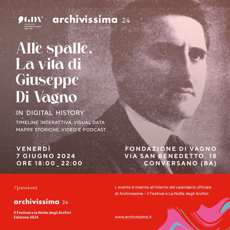 L'Archivio e la Biblioteca della Fondazione "Giuseppe Di Vagno (1889-1921)", con sede nel Monastero San Benedetto a Conversano, il 7 Giugno dalle 18:00 alle 22:00 rimarranno aperti. Verrà mostrata al pubblico, con la possibilità di interazione, la web app creata dalla Fondazione per la divulgazione dei contenuti storici riguardanti la vita e la storia di Giuseppe Di Vagno collocata nel suo contesto storico. Attraverso visual data, mappe storiche interattive, timelines, collegamenti con siti internet di divulgazione, si vuole raggiungere l'obiettivo di ampliare la rete sociale raggiungibile, favorendo la connessione e rafforzando il legame di tutti coloro che si ispirano e credono ai valori della democrazie e dell'antifascismo. Tutto supportato dalla presenza di due mostre interamente dedicate a Di Vagno e alla sua Vita.