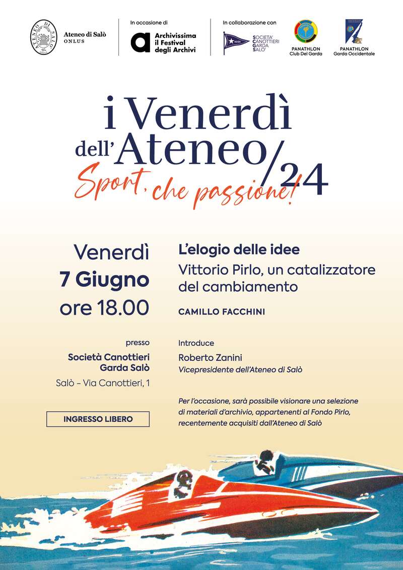 La serata organizzata dall'Ateneo di Salò in collaborazione con Canottieri Garda Salò e Panathlon Garda occidentale sarà l'occasione per presentare al pubblico una selezione dei documenti donati dalla famiglia Pirlo e che ripercorrono un periodo importante della storia sportiva salodiana. Vittorio Pirlo, infatti, è stato nel secondo dopoguerra una delle figure di riferimento per lo sviluppo della città. Figura poliedrica e ricca di sfaccettature, quella di Pirlo, viene qui riletta nella sua dimensione di appassionato sportivo, alla guida delle più prestigiose società sportive della sponda bresciana del lago di Garda. Attraverso i documenti originali verrà proposto un viaggio affascinante attraverso le #passioni di un uomo straordinario.